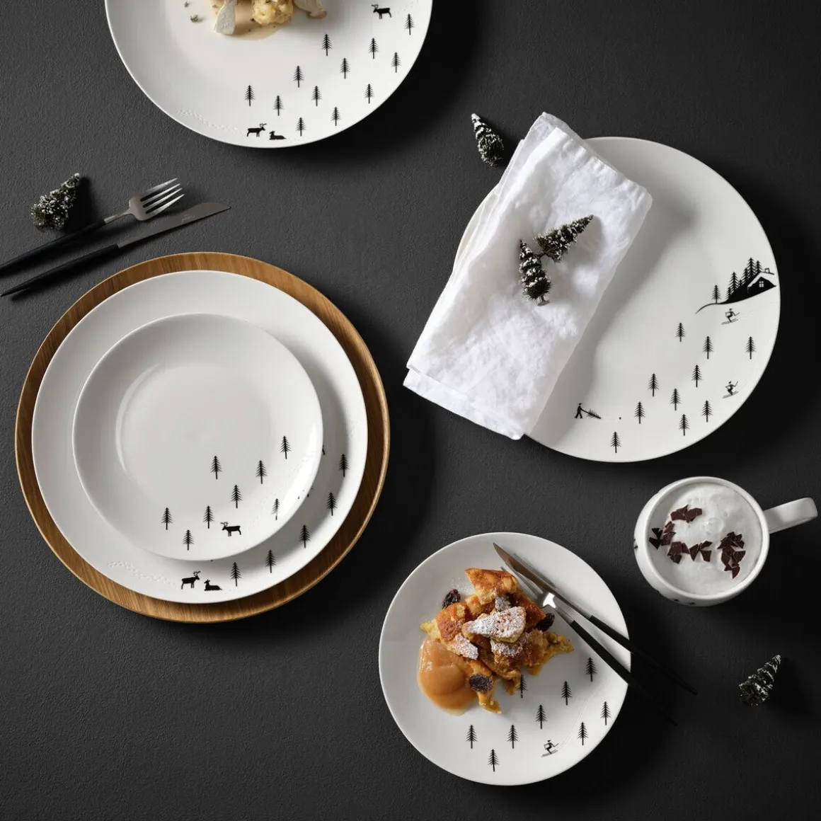 Mit dem Dessertteller Joy Snow Tracks von bringen Sie den Look einer verführerischen Winterlandschaft mit den wohltuenden Farben und Aromen Ihrer Desserts zusammen. Neben den dunklen Silhouetten der Tannen und des Hirsches kommen Ihre Köstlichkeiten blickfangend zur Geltung.