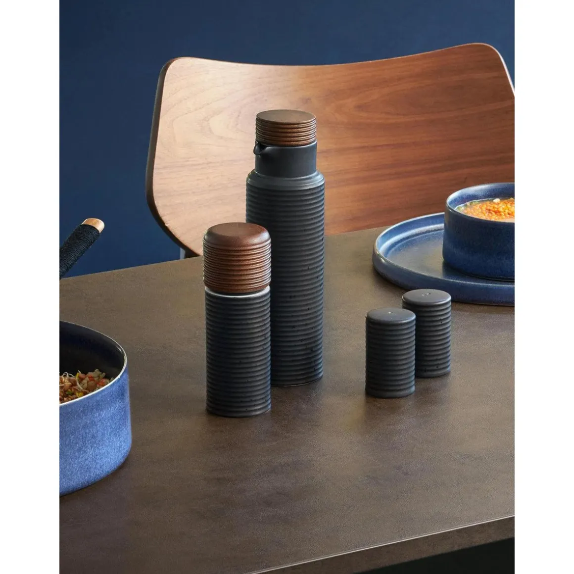 Die Essig- und Ölflasche Coppa Kuro von begeistert durch ihren charmanten Look, der von einem Rillenrelief und gesprenkelten Farbfacetten geprägt ist. Eine reaktive Glasur bringt die Sprenkel hervor und sorgt so für Einzigartigkeit in der Optik.