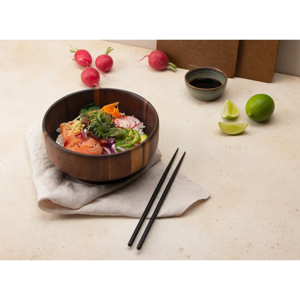 Mit der formschönen Schüssel Akazie von kredenzen Sie Ihre Bowls, kleine Salate oder Snacks auf einer leicht erhöhten Ebene. Für den beinah schwebenden Ausdruck ist der schmale Fuß verantwortlich, der schwungvoll in die Seitenwände übergeht. Das dunkle Akazienholz sorgt mit seiner einmaligen Maserung für einen blickfangenden Effekt und lädt zum Zugreifen ein.