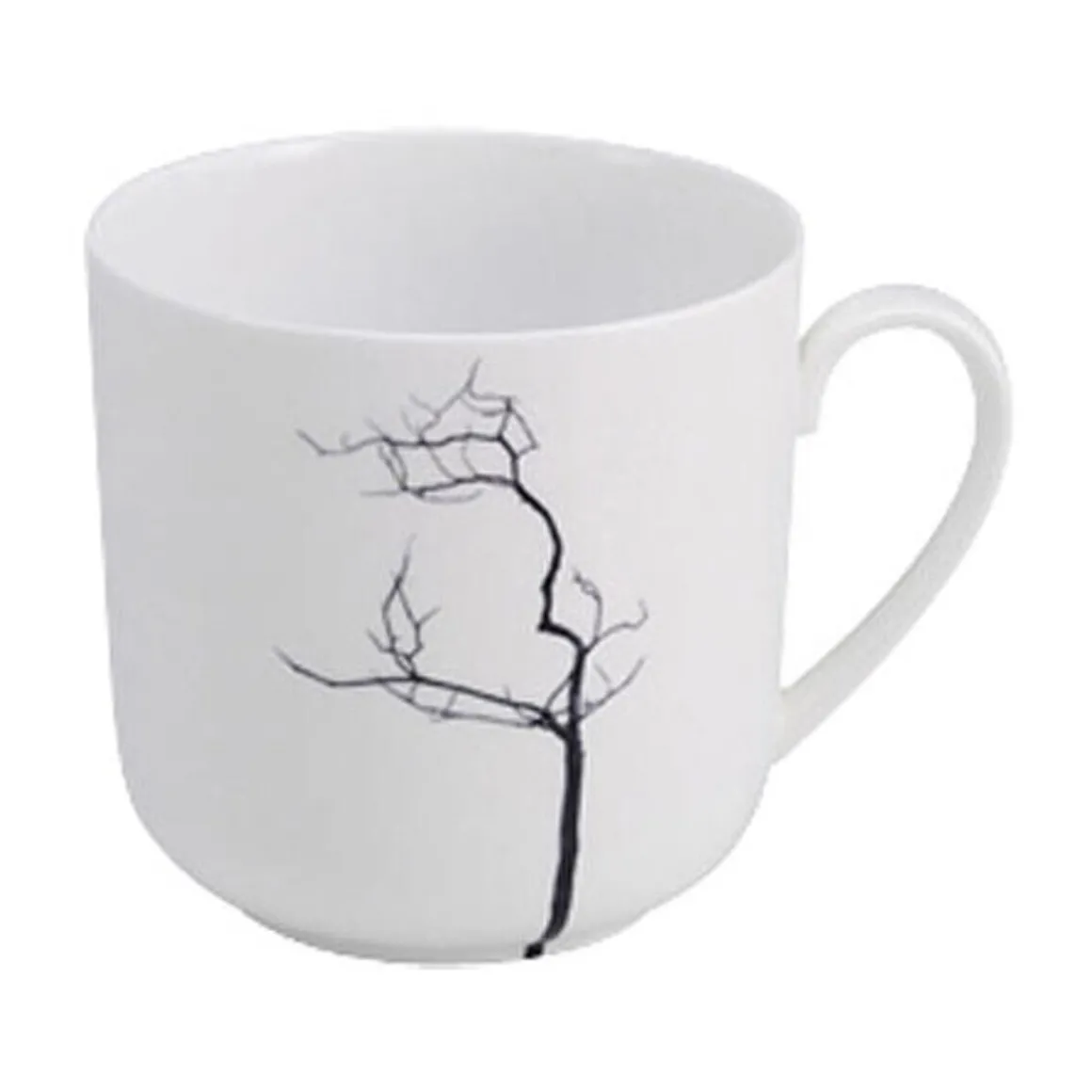 Er hat ein Fassungsvermögen von 0,32 l und eignet sich für Kaffee, Tee und heiße Schokolade. Gefertigt ist das zeitlose Modell aus hochwertigem Knochenporzellan in Weiß. Auf der Vorderseite zeigt sich die Skizzierung eines schwarzen, blattlosen Baumes, ansonsten ist das Modell schmucklos gehalten. Der Becher mit Henkel ist spülmaschinenfest und auch für die Mikrowelle gut geeignet.