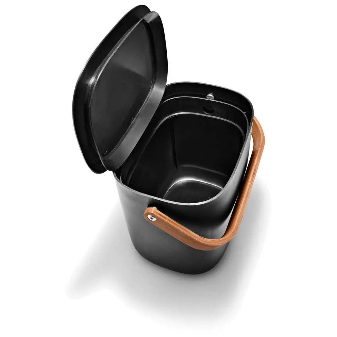 - Deckel bleibt durch sein automatisches Greifen offen und balanciert während der Entsorgung auf dem Rand des Eimers
