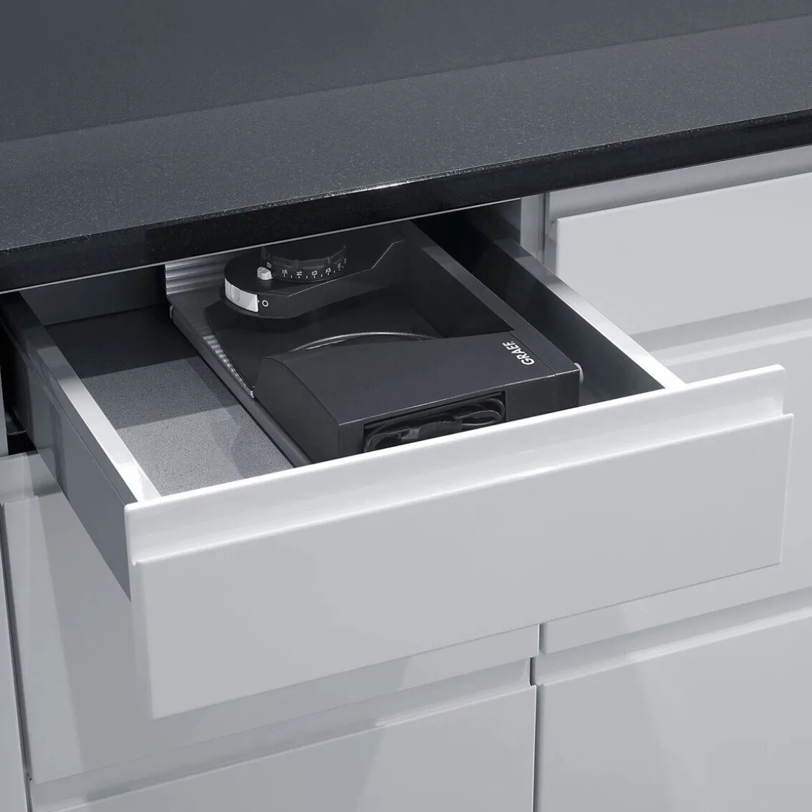 - herausschwenkbares Kabelfach nimmt das Kabel komplett auf
