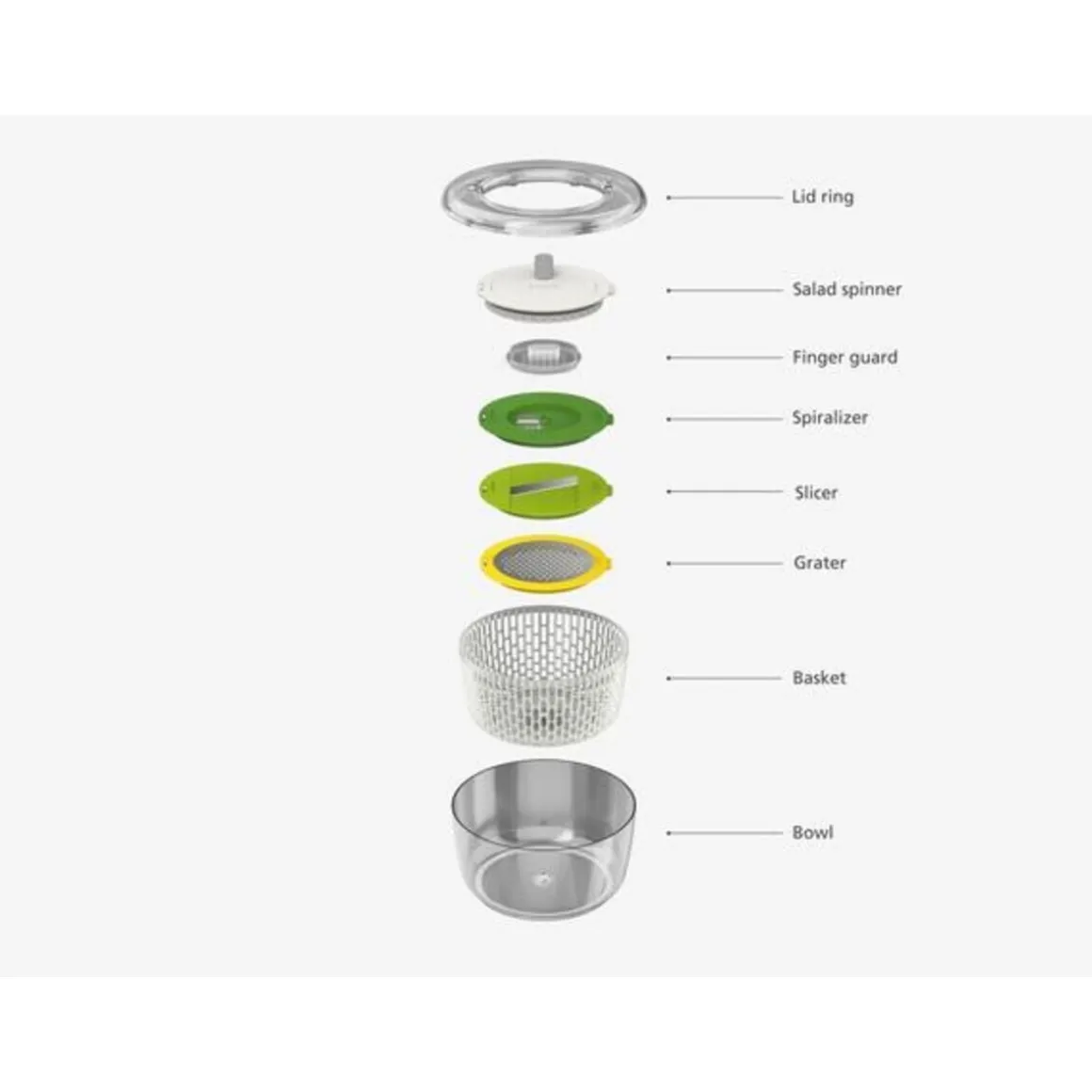 - Salat-Zubereitungsset Meal-Prep mit vier austauschbaren Einsätzen für unterschiedliche Aufgaben