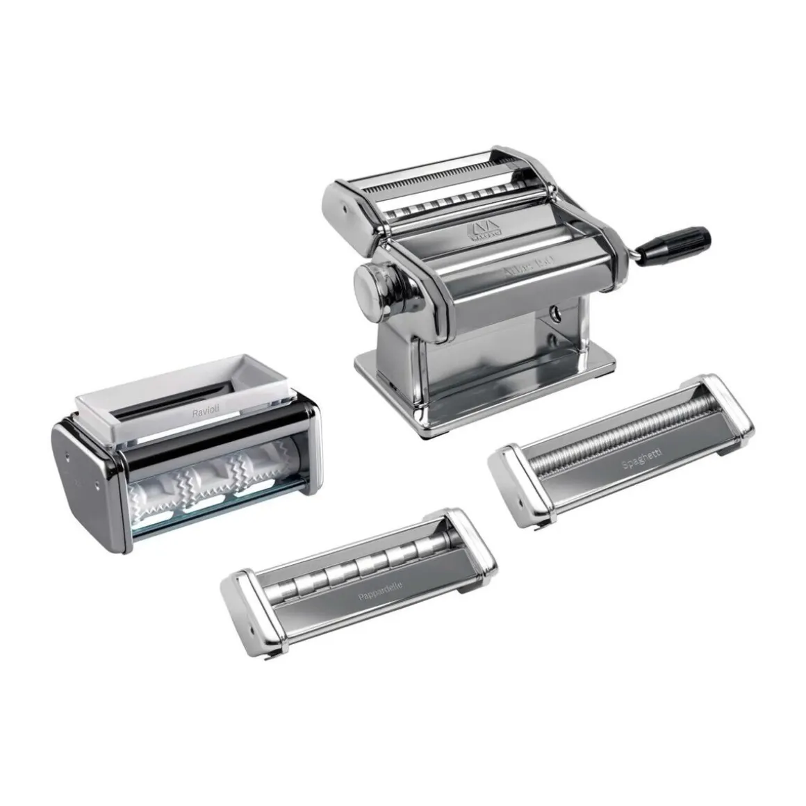 - besteht aus einer Nudelmaschine Atlas 150 Classic und 3 einsetzbaren Sonderzubehörteilen