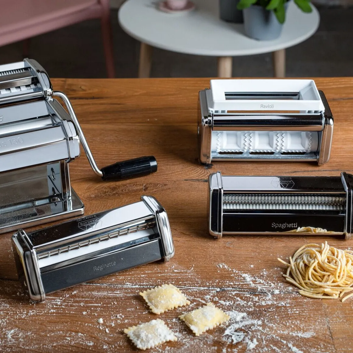 - inkl. Zubehör für Spaghetti (12 mm), Pappardelle (10 mm) und Ravioli (45×45 mm)