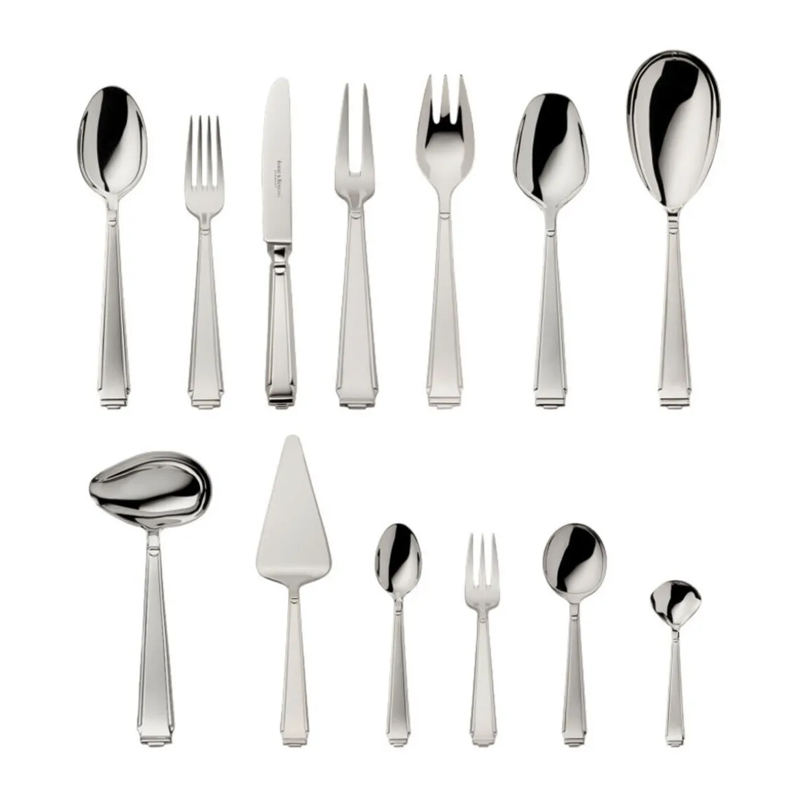 12 x Menülöffel, 12 x Menügabel, 12 x Menümesser, 12 x Kaffeelöffel, 12 x Kuchengabel, 2 x Fleischgabel groß, 1 x Gemüselöffel, 1 x Gemüsegabel, 1 x Servierlöffel, 1 x Sahnelöffel, 1 x Saucenlöffel, 1 x Tortenheber, 1 x Zuckerlöffel
