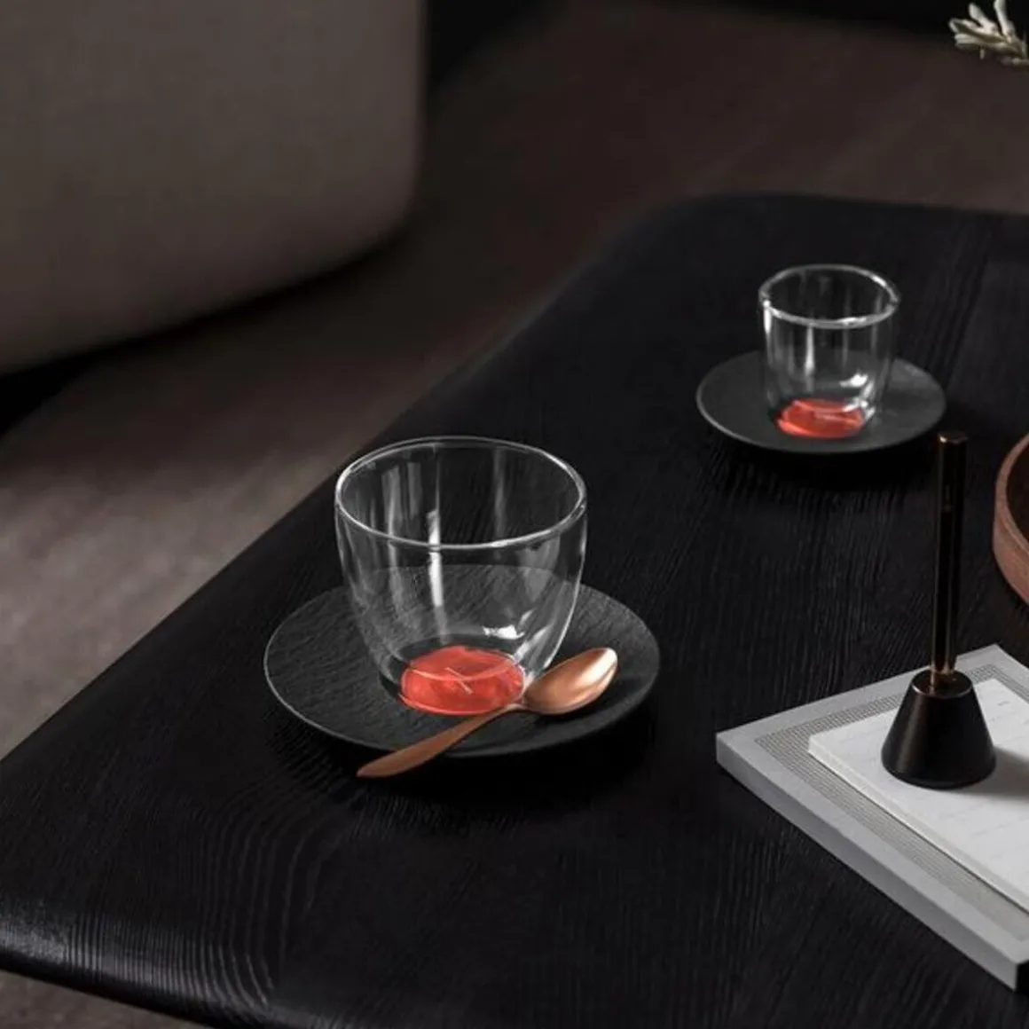 Die Café au Lait Untertasse aus der Serie Manufacture Rock Glow von zeugt von Lebendigkeit und agiert mit ihrem markanten Look gegen jede Art von Langeweile auf der Tafel. Das schwarze, schieferähnliche Erscheinungsbild wird von einem Mittelpunkt im Kupferton akzentuiert und zieht so die Blicke auf sich.