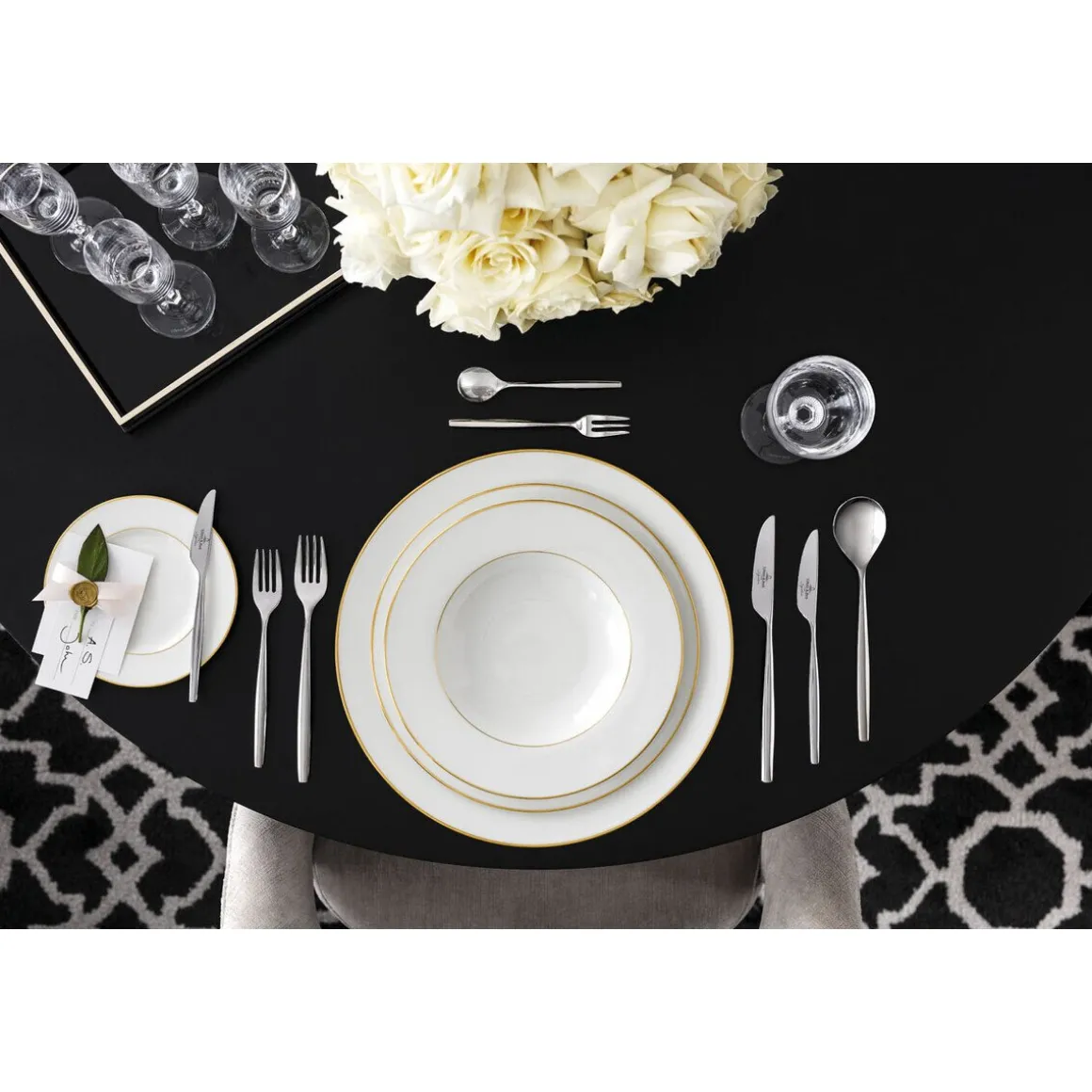 Der Suppenteller Anmut Gold von begeistert durch seine breite Fahne, die beidseitig von einer schillernden Goldkontur abgeschlossen wird. Das samtige Weiß und der feine Goldglanz schmeicheln Ihren Suppen und lassen diese formvollendet in Erscheinung treten. Schaffen Sie mit diesem Geschirrstück ein Tischbild mit hoher Wertigkeit.