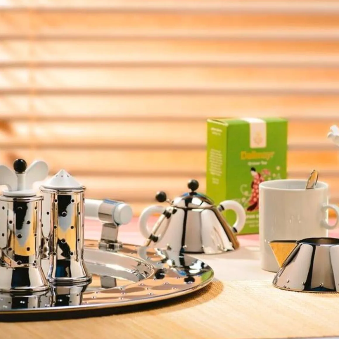 Die Pfeffermühle 9098, die Designer Michael Graves für das italienische Designhaus entwarf, begeistert Designfans rund um den Globus seit den 1980er- und 1990er-Jahren. Typische Designelemente sind geometrische Formen wie Kegel, Kugel und Zylinder. Sie ziehen sich durch die gesamte Kollektion. Sehen Sie sich den dazugehörigen Salzstreuer, die Zuckerdose, den Wasserkessel mit pfeifendem Vögelchen und das Rahmkännchen an. Jedes Stück für sich zieht alle Blicke auf sich. Denn Graves mixt Einflüsse aus Art-Déco, Pop-Art und Comic-Kunst in seinen Entwürfen, die heute echte Kultobjekte sind.