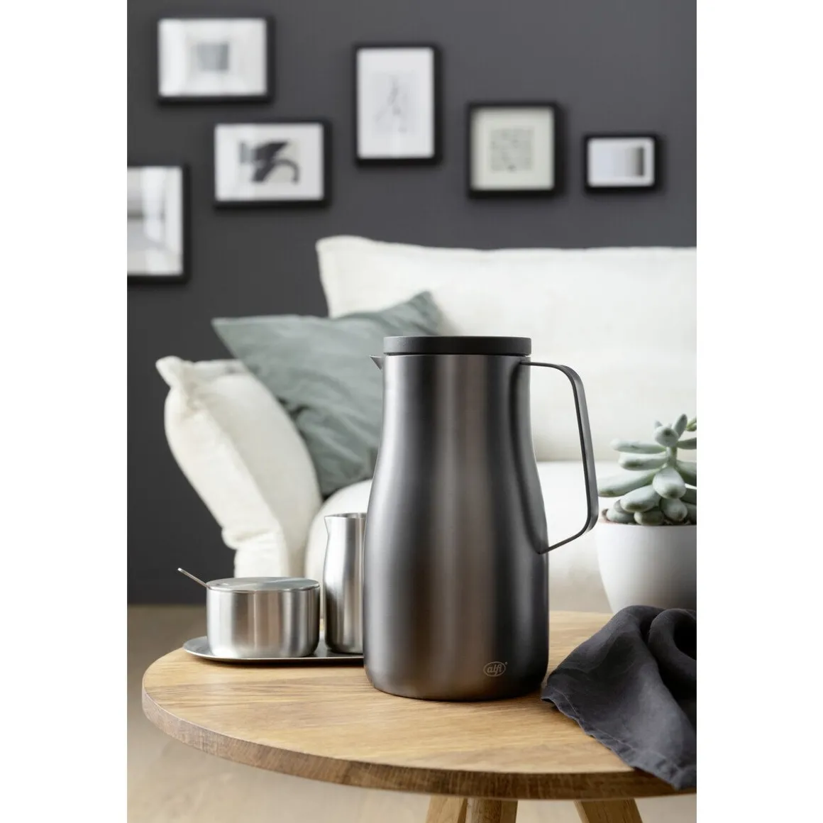 Die Isolierkanne Studio von ist mit einem widerstandsfähigen Einsatz aus Edelstahl ausgestattet, der dafür sorgt, dass Ihre Getränke für lange Zeit auf der gewünschten Temperatur bleiben. Ganz nebenbei sieht die Kanne mit ihrer dunkel mattierten Optik noch unverschämt gut aus, wodurch sie auf der Tafel ansprechend zur Geltung kommt.