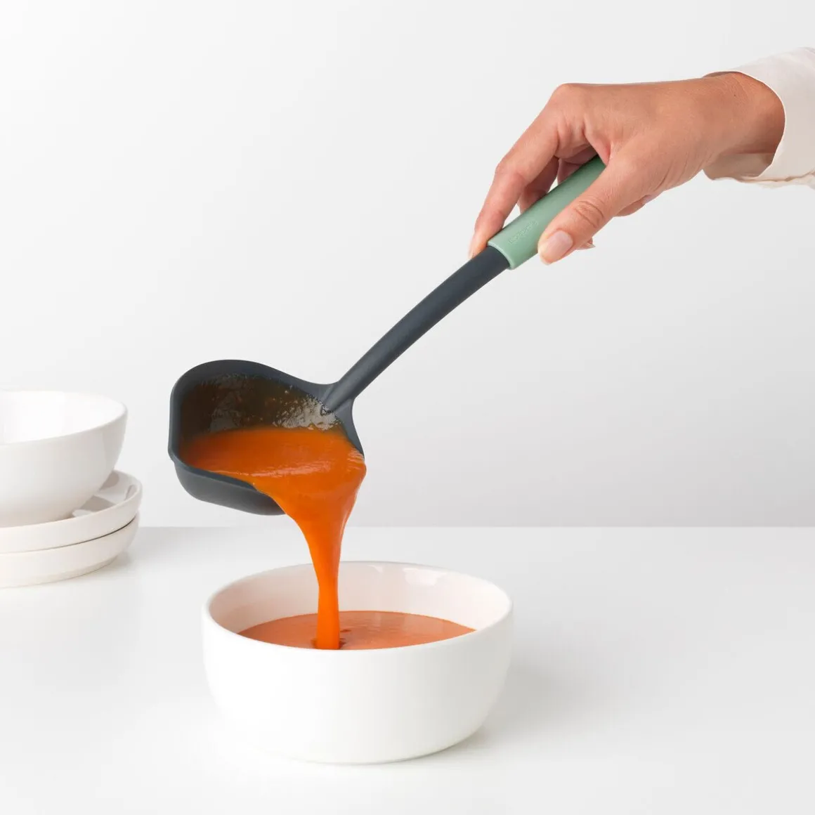 Der Suppenlöffel Tasty+ Jade Green von macht das Kredenzen von Suppen stilsicher möglich. Mit dem praktischen Schnabel lässt sich sogar der letzte Rest aus jedem Winkel des Topfes schöpfen, sodass sich das Stück auch als Schaber Tasty+ Jade Green einsetzen lässt.