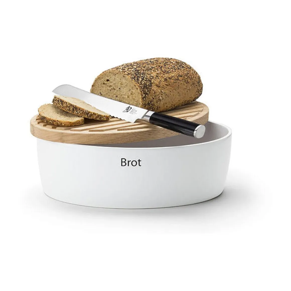 Der praktische Brottopf von aus weißer Keramik passt mit seinem hellen Holzdeckel in jede Küche. Das Brot bleibt darin lange frisch, dafür sorgen die seitlichen Belüftungslöcher. Die Rückseite des Deckels ist nicht nur zum Verschließen des Topfes gedacht, es hat eine zweite Funktion und dient als Brotschneidebrett.