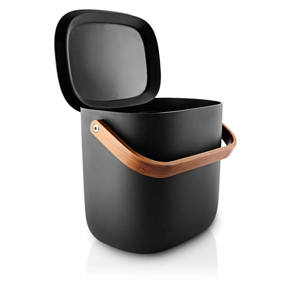 - Deckel bleibt durch sein automatisches Greifen offen und balanciert während der Entsorgung auf dem Rand des Eimers