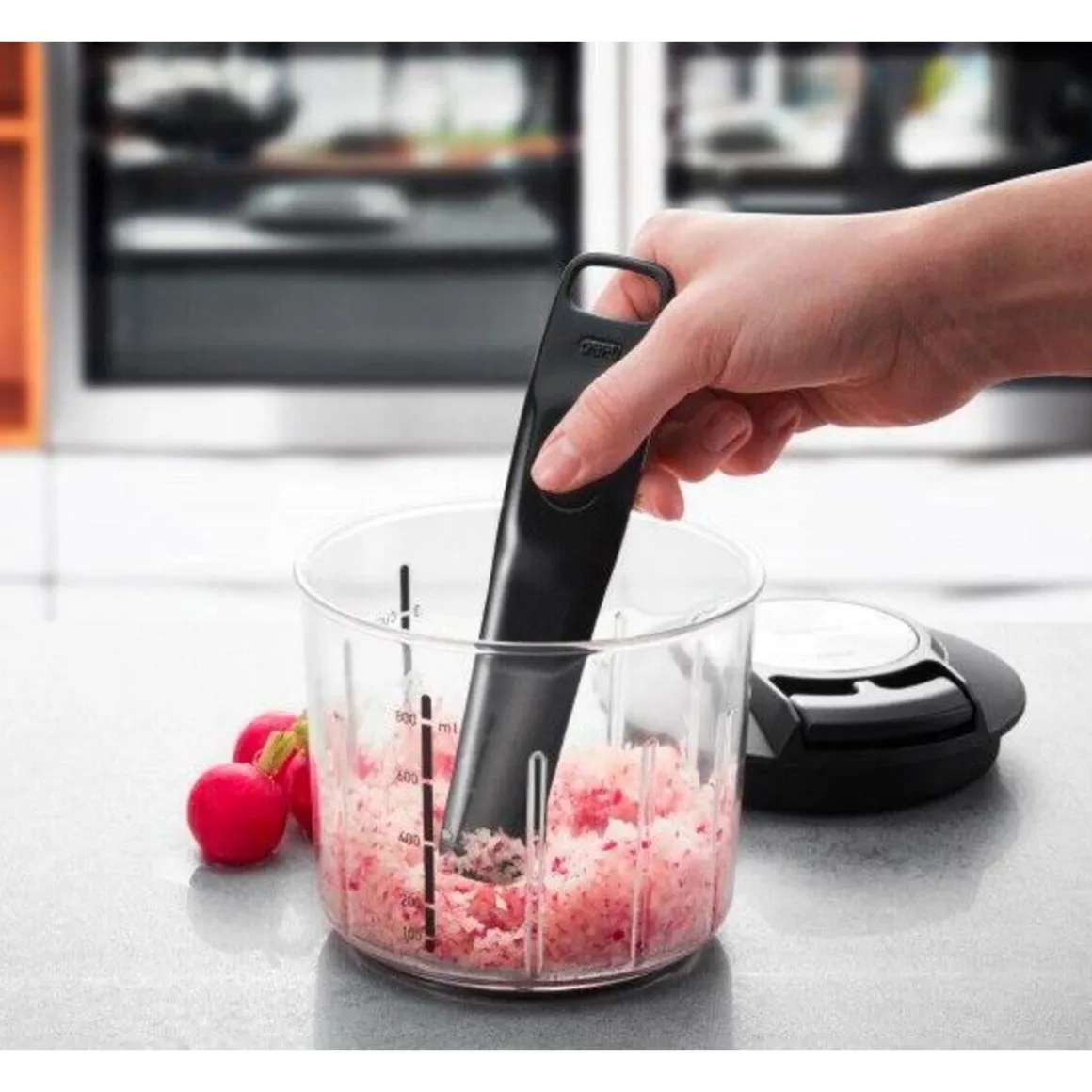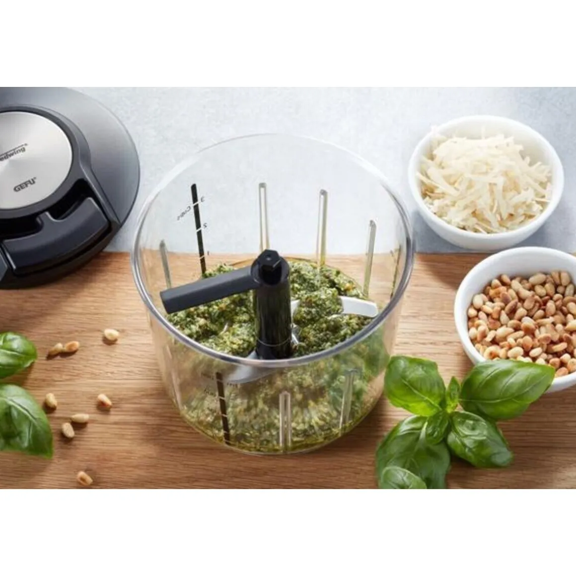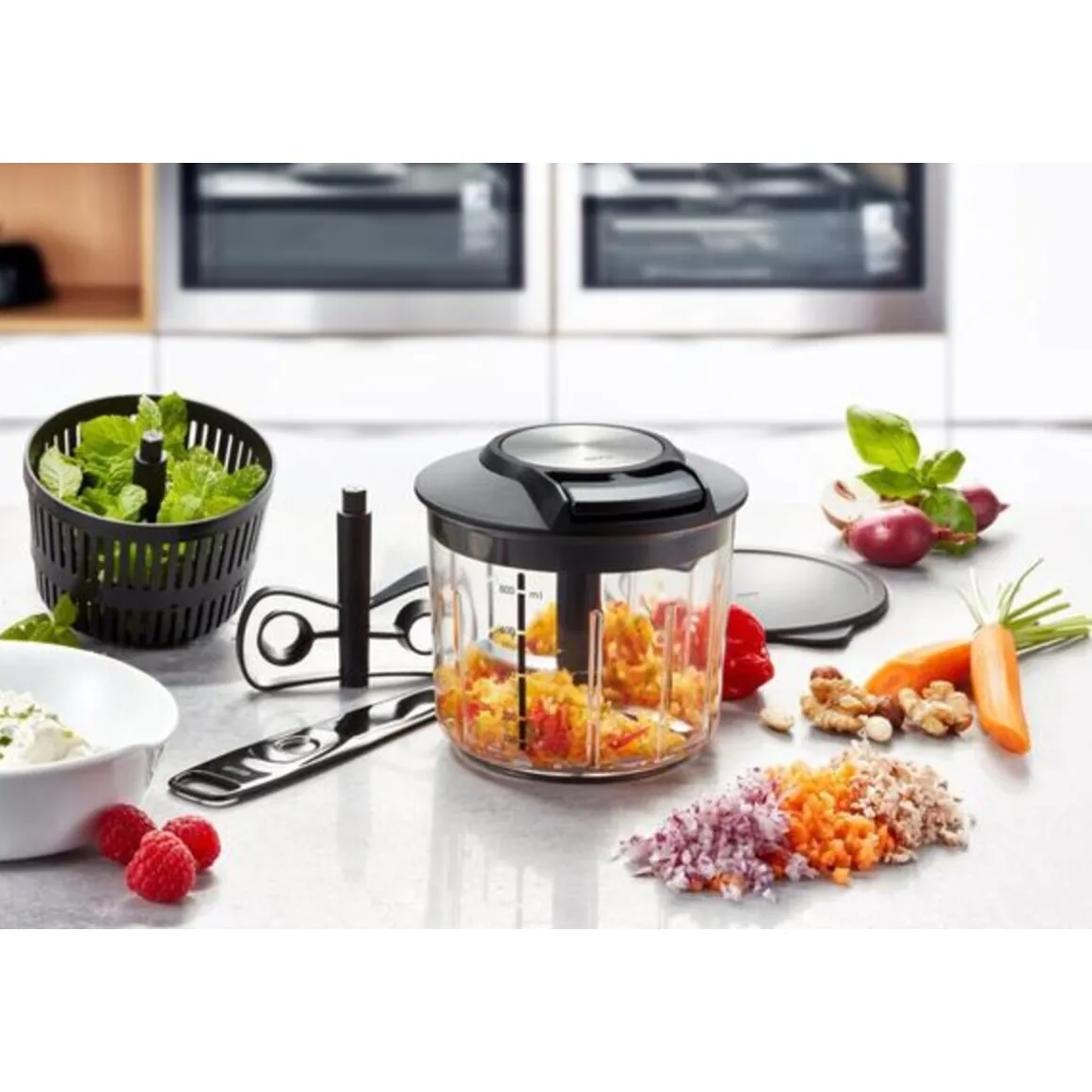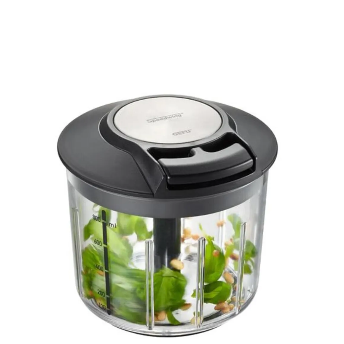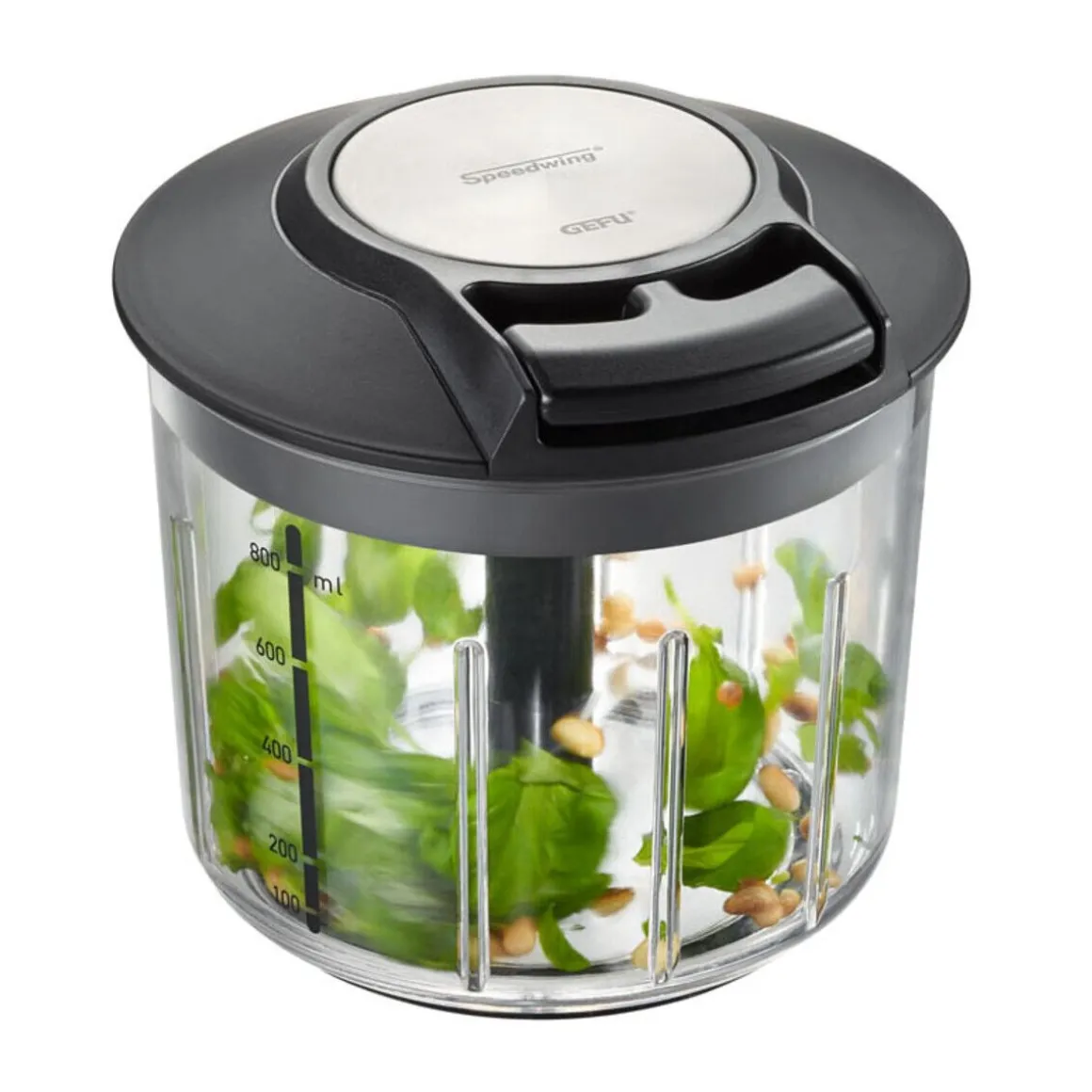Das Multitalent der Marke ist eine große Hilfe in der Küche, versprochen! Denn der Multizerkleinerer Speedwing zerkleinert mit seinen extrascharfen Schneiden aus japanischem Klingenstahl und mithilfe einer fein ausgetüftelten Seilzugtechnik Obst und Gemüse, Zwiebeln und Nüsse. Auch das Rühren von hausgemachten Salatdressings, Dip-Variationen und cremigen Desserts geht leicht von der Hand. Genauso gut schleudern Sie frisch gewaschene Kräuter trocken.