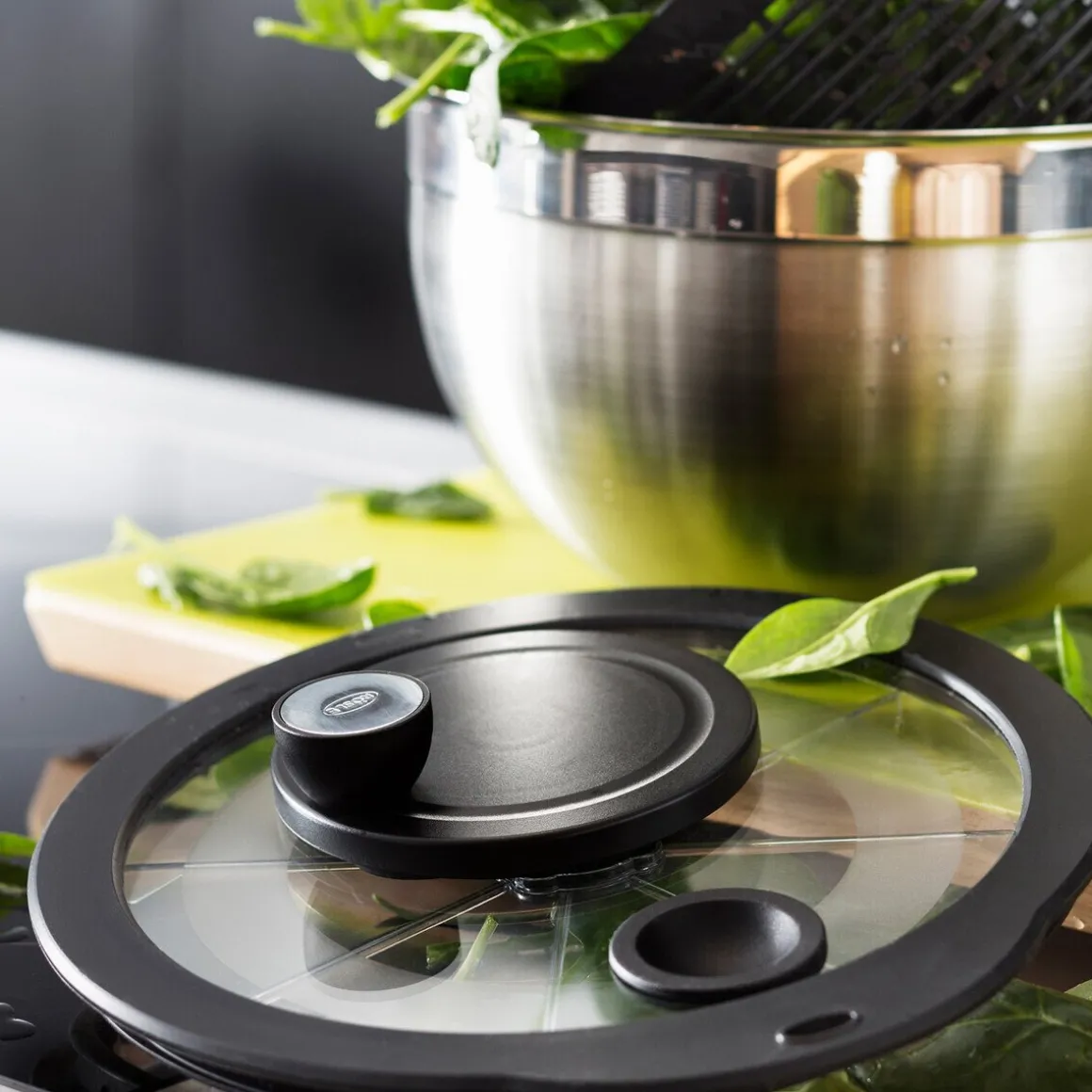 - Salatschleuder bestehend aus einer robusten Schüssel aus Edelstahl, einem Deckel aus gehärtetem Glas, einem Korbeinsatz aus Kunststoff und einem Drehteller