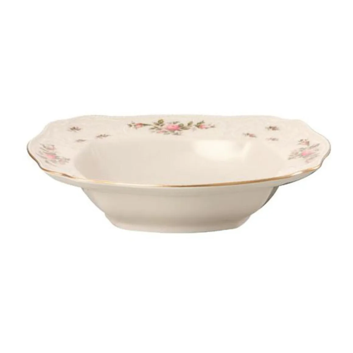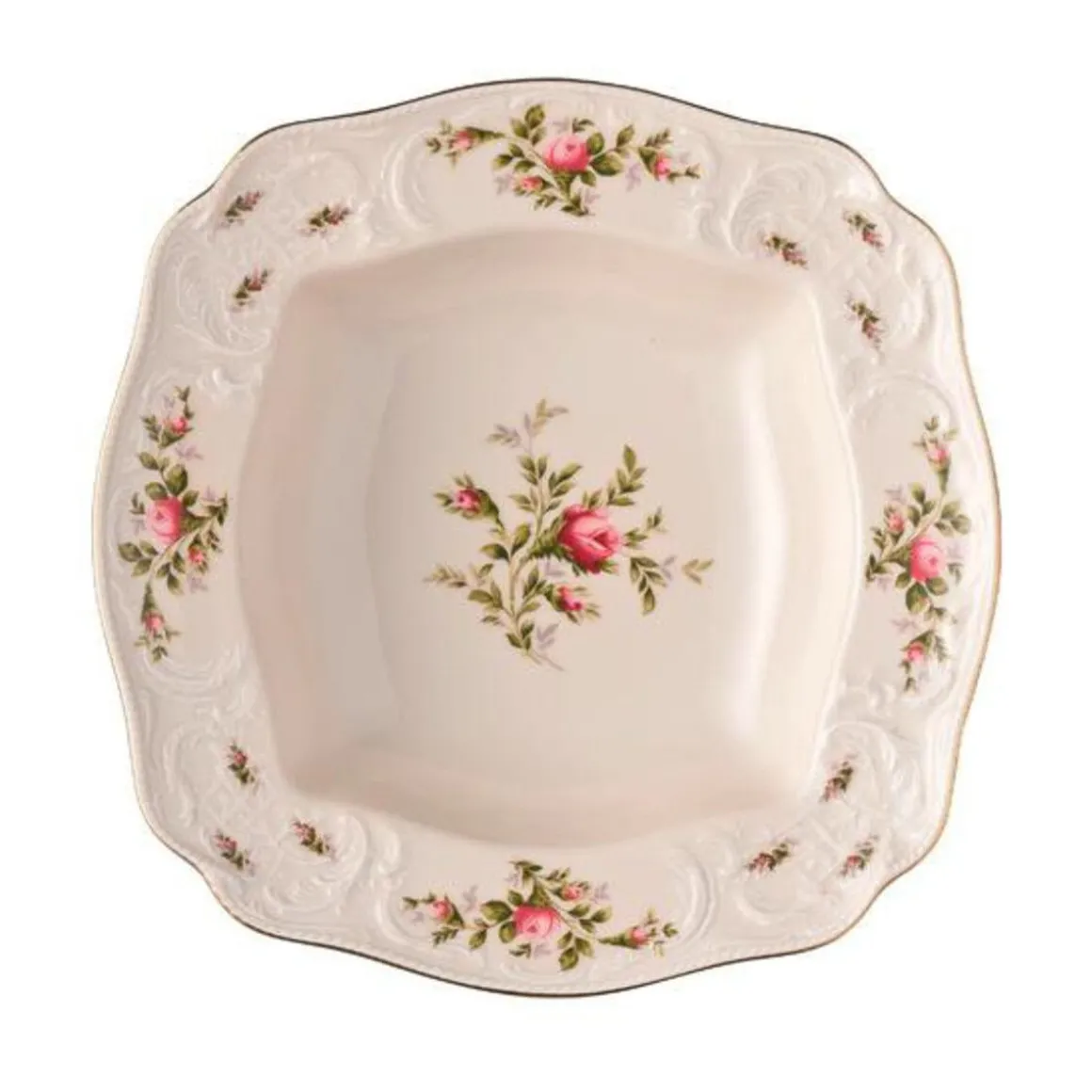 Mit der quadratischen Schüssel der Geschirrkollektion Sanssouci Elfenbein Moosrose neu Poliergold Ramona von servieren Sie Ihre Beilagen oder Salate ganz im Sinne des Rokoko. Inspiriert von der Decke im Schloss Sanssouci, besticht das klassische Porzellan durch sein haptisch angenehmes Relief und das blühende Dekor. Abgerundet wird das lebensfrohe Erscheinungsbild durch eine goldene Kontur, die sich über den geschwungenen Rand zieht.