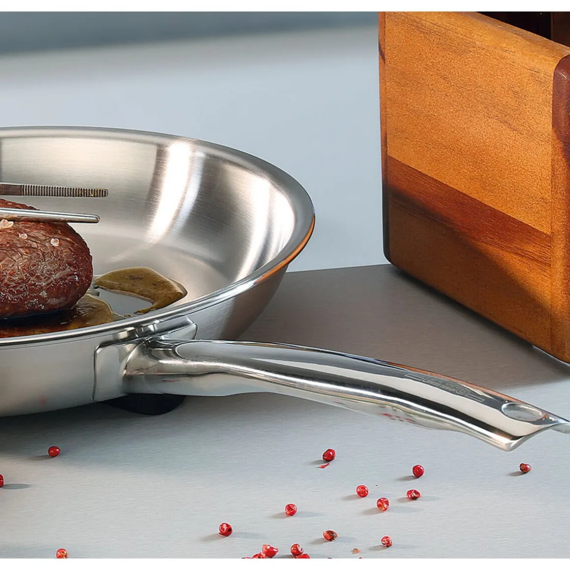 Für eine optimale Wärmeleitung und Hitzeverteilung ist die hochwertige Bratpfanne der Serie Brigade Premium aus dem Hause mit einem 5-Lagen Mehrschichtmaterial ausgestattet.