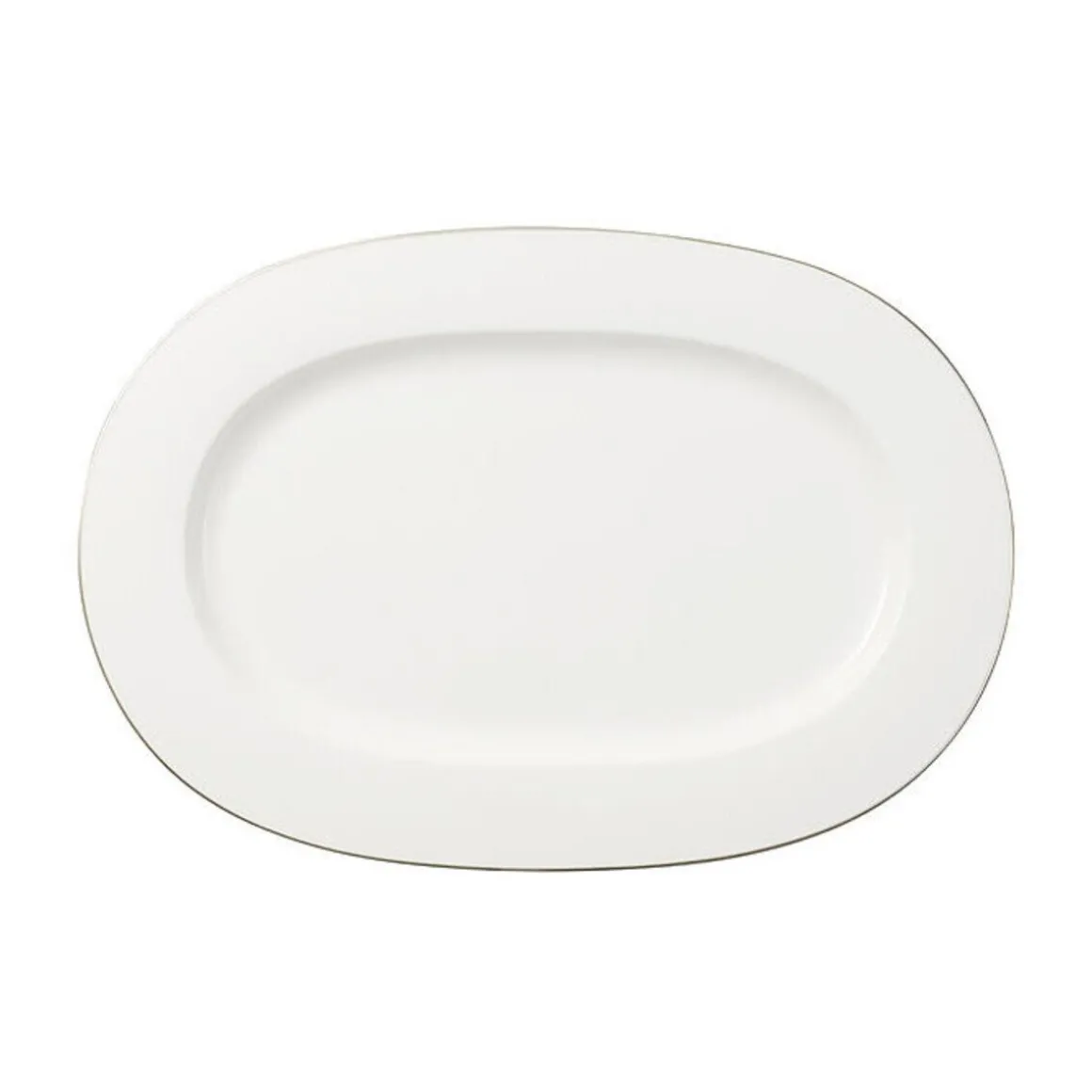 Die ovale Platte Anmut Platinum No.1 von Villeroy & Boch sorgt für glanzvolle Momente auf jeder Festtagstafel. Sie beeindruckt durch ihr zeitlos klassisches Design und das handgemalte Platin-Filet am Rand. Es verleiht der Servierplatte eine elegante Note und zieht alle Blicke auf sich. Aufgrund ihrer Größe von 42 cm ist sie die perfekte Lösung zum Servieren eines Bratens mit allen Beilagen. Selbstverständlich eignet sich die Platte auch ideal für Vorspeisen-Kreationen oder Kuchen.