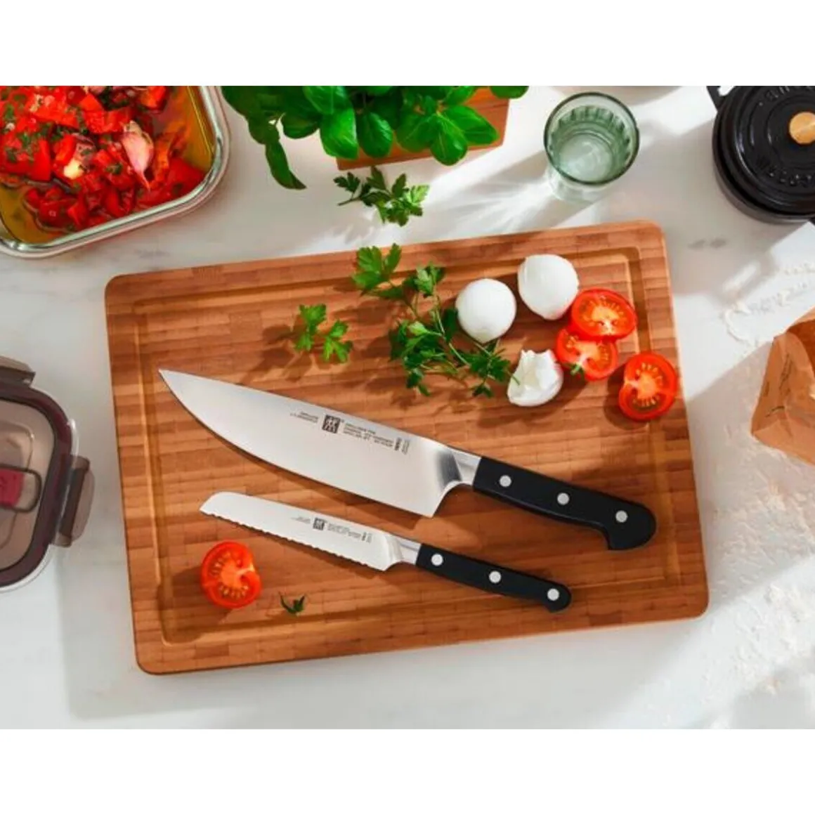 Das vielseitige Universalmesser Pro von überzeugt durch seinen Wellenschliff, der behände durch Brot, Wurst oder Käse flitzt. Selbst Tomatenhäute lassen sich mit dieser scharfen Klinge präzise und gekonnt durchtrennen, was die Vielseitigkeit dieses Küchenmessers einmal mehr hervorhebt.